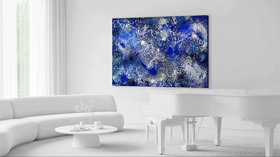 Layers of expressive splatter and atmospheric diffusion suggest techniques akin to those used by Jackson Pollock or contemporary action painters, where control and chaos are held in delicate tension. The work’s textured surface and celestial palette make a sophisticated statement with both energy and depth.